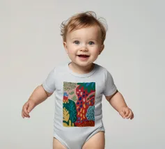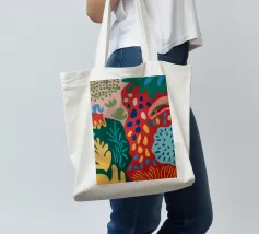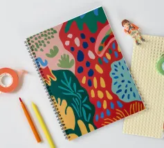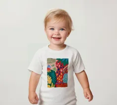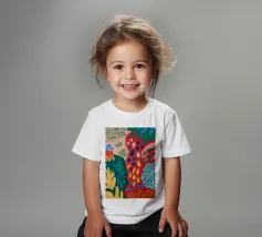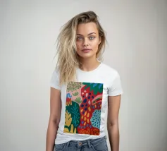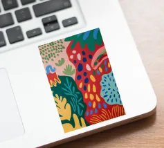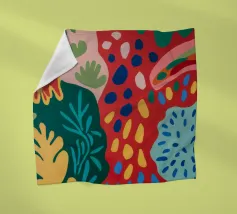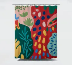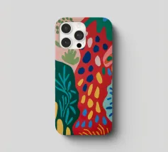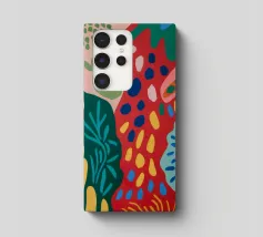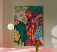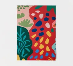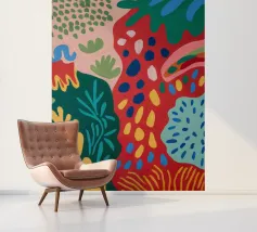 Een levendig abstract botanisch patroon met gestileerde bladeren, bessen en organische vormen. Het ontwerp maakt gebruik van felle kleuren zoals rood, roze, blauw, geel en groen, met sommige elementen tegen een donkerder achtergrondgedeelte, waardoor een levendig, pop-art gevoel ontstaat.