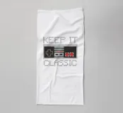 Een retro gamecontroller is afgebeeld met de zin "KEEP IT CLASSIC" in gepixeleerde tekst. Het ontwerp roept nostalgie op door de vintage esthetiek en het eenvoudige kleurenpalet.