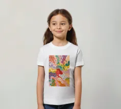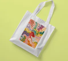 Een dynamische compositie barst van de organische vormen en levendige kleuren en suggereert een geabstraheerd bloemenlandschap. Warme rode en oranje tinten vermengen zich met koele blauwe en groene tinten, waardoor een gevoel van levendige beweging en natuurlijke uitbundigheid ontstaat.