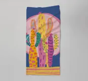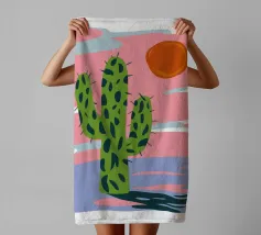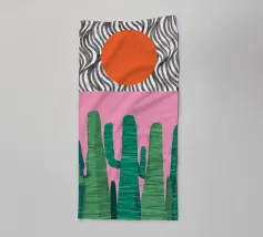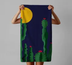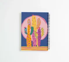 A whimsical illustration depicts colorful cacti in a pot, set against a large, patterned circle representing the moon or sun, creating a magical and surreal desert night scene.