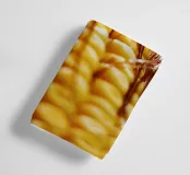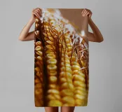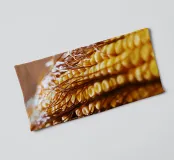 Een rauwe maïskolf verticaal gevangen, waarbij de netjes gelijnde pitten en de vloeiende bruine zijde zichtbaar zijn. De natuurlijke texturen en subtiele kleuren creëren een abstracte maar speelse compositie, waardoor het een eigenzinnige en charmante toevoeging is aan keukens, eethoeken of moderne eclectische ruimtes.