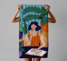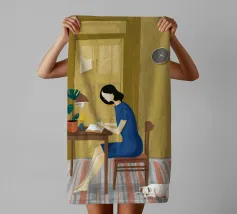 An illustration of a woman intently reading a book at her desk, surrounded by houseplants and illuminated by a lamp, conveying a sense of quiet focus.