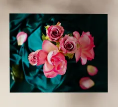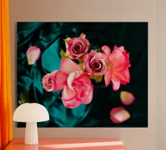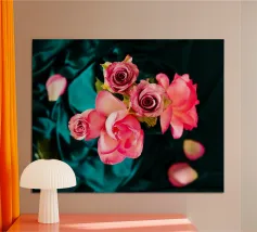 Delicate roze rozen, gelaagd in zachte golven van kleur, gevangen tegen een donkere, stemmige achtergrond met een subtiel vleugje licht. Hun tedere schoonheid straalt nog levendiger op de diepe achtergrond en creëert een gevoel van stille elegantie en intimiteit. Dit kunstwerk is geschikt voor ruimtes zoals slaapkamers, lounges, eetkamers of op boetieks geïnspireerde interieurs waar een vleugje romantiek en verfijning gewenst is.