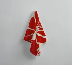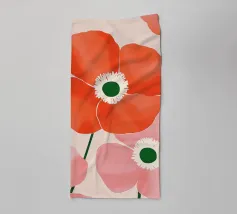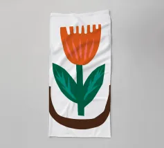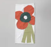 Een simplistisch bloemontwerp met een rood-oranje bloemblaadjesarrangement met een groen hart en lichtgroene steel, geeft het een speelse, gesneden papieren esthetiek. De felle kleuren en geometrische vormen creëren een moderne en abstracte uitstraling.