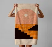 Een minimalistische compositie die gedurfde trapachtige vormen combineert met een stralende zon die een raam opent naar een abstracte oranje zee. Dit kunstwerk brengt rust en energie in balans, waardoor het een opvallend accentstuk is voor elke moderne woonruimte.