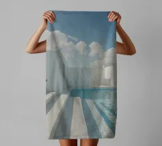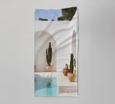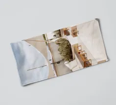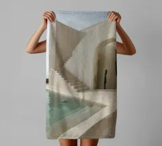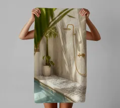 Ontsnap naar een bohemien paradijs met deze prachtige foto van een witte buitendouche op een zonovergoten dak in Marrakech. Het minimalistische ontwerp met zijn strakke lijnen en natuurlijke texturen past perfect bij de warme Marokkaanse zon en creëert een oase van rust hoog boven de stad. Omringd door witte muren en terracotta tegels en een zacht briesje, roept deze serene ruimte een gevoel van vrijheid en ontspanning op. Dit beeld is ideaal om je huis te voorzien van de relaxte elegantie van de Marokkaanse stijl en weerspiegelt de schoonheid van het buitenleven en de tijdloze charme van Marrakech.