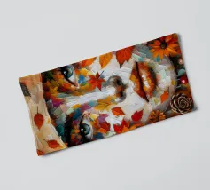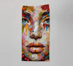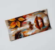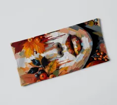 Acrylschilderij van het gezicht van een vrouw tijdens de herfst. Met bladeren, pompoen, eikels en bessen.
