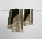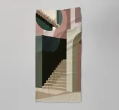 Een abstracte architecturale ruimte wordt gedefinieerd door een strakke trap en overlappende bogen, met een dramatisch spel van licht en schaduw dat een krachtige, minimalistische compositie creëert.