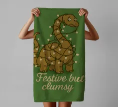 A cheerful green dinosaur is humorously decorated to resemble a Christmas tree, complete with colorful lights and a star on its head. The words "Tree Rex" are playfully written beside it, adding to the festive theme.