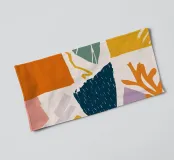 Een abstracte collage van versplinterde, overlappende vormen in een levendig palet van oranje, blauw en roze creëert een dynamische, energieke en moderne compositie.