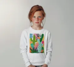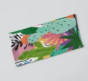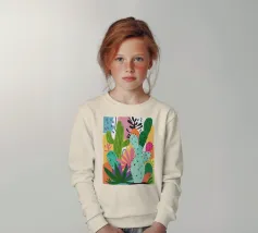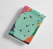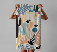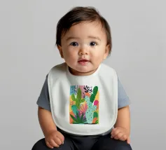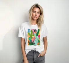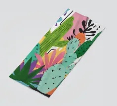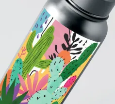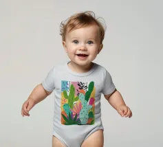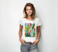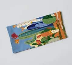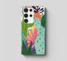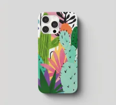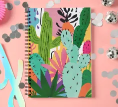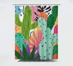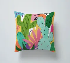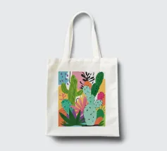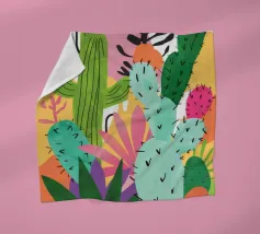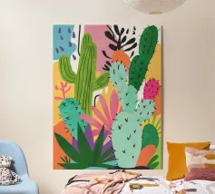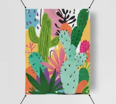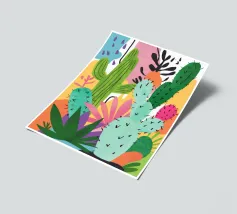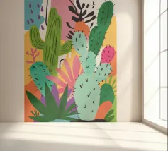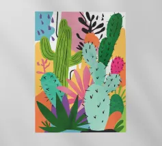 Een kleurrijke en gestileerde afbeelding van een levendige cactustuin tegen een heldere achtergrond. De gevarieerde vormen en levendige kleuren van de cactussen creëren een vrolijk en uitnodigend woestijnlandschap.
