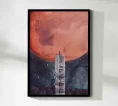 Een surrealistische digitale collage van natuur, technologie en existentiële afstandelijkheid. Een gezichtsloze figuur met een retro CRT-monitor als hoofd, staand in een tropisch oerwoud. Op het scherm staat "YOU'RE OFFLINE" - een stille rebellie tegen hyperconnectiviteit. Met sterke contrasten, levendige kleuren en een opvallende rode zon achter het onderwerp legt dit werk het gevoel van ontkoppeling vast in een wereld met te veel verbindingen. Perfect voor fans van botanisch surrealisme, moderne collagekunst en digitaal escapisme.