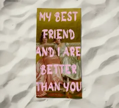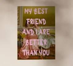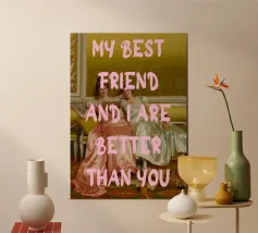 Vier jullie onbreekbare band met "My Best Friend and I Are Better Than You", een geestige pop-artprint die klassieke elegantie combineert met een speelse, moderne verklaring van vriendschap. Op dit fascinerende kunstwerk staan twee serene historische figuren, elegant neergezet op een luxe bank, schijnbaar verdiept in een boek. De vetgedrukte, warmroze tekst "MY BEST FRIEND AND I ARE BETTER THAN YOU" overlapt de afbeelding en verandert het tijdloze tafereel in een humoristische en zelfverzekerde verklaring van exclusiviteit. Perfect om persoonlijkheid en een vleugje luchthartige charme toe te voegen aan elke moderne ruimte. Gemaakt op een
