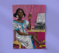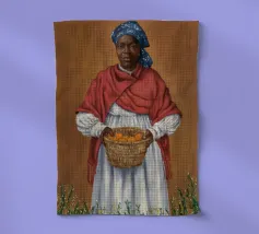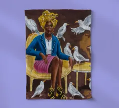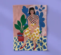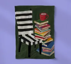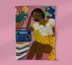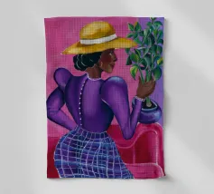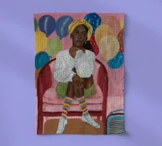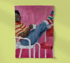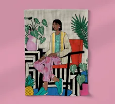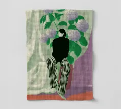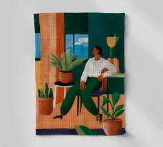 Dit kunstwerk toont een persoon die op een gestreepte stoel zit, omringd door zonnebloemen en een groene tas. De achtergrond is gedempt bruin en creëert een rustieke en reflecterende sfeer.