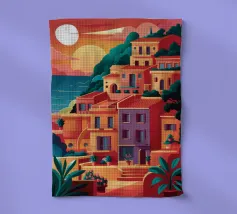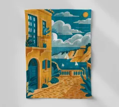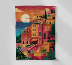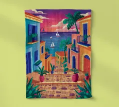 Een adembenemend uitzicht op een levendige mediterrane trap, geflankeerd door kleurrijke gebouwen en weelderige palmbomen. Het perspectief trekt het oog omhoog naar een heldere hemel en creëert een gevoel van optimisme, avontuur en de droom van een perfect zomerverblijf.