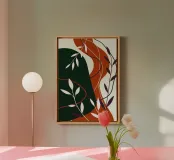 Deze moderne abstracte print heeft een rustgevend palet van diep smaragdgroen en warm terracotta oranje, geaccentueerd door sierlijke witte en pruimkleurige botanische elementen. De vloeiende, organische vormen en contrasterende kleuren creëren een gevoel van harmonie en natuurlijke beweging, waardoor het een perfect stuk is om een vleugje aardse verfijning in elke woonruimte te brengen.