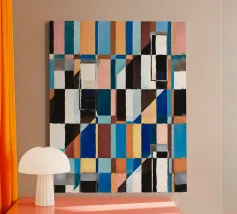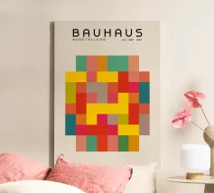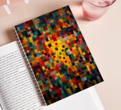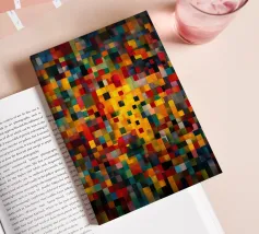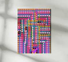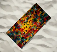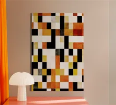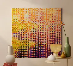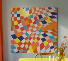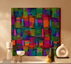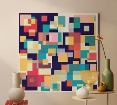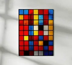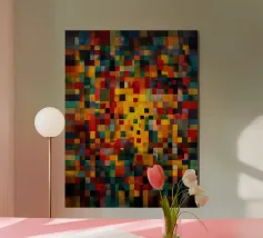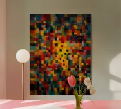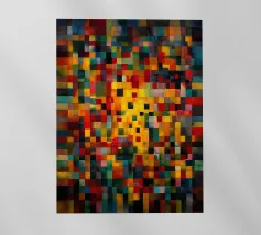 Dit kunstwerk, dat doet denken aan de kleurenstudies van Johannes Itten en de vierkanten van Paul Klee, is een eerbetoon aan de pure expressieve kracht van kleur. De compositie van ontelbare vierkanten creëert een fascinerende gloed vanuit het midden die vervaagt naar donkere, rijke tinten aan de randen. Het is een meesterlijk samenspel van contrasten en harmonieuze overgangen dat op indrukwekkende wijze de principes van de Bauhaus-kleurentheorie demonstreert. Een energiek statement dat elke ruimte vult met warme intensiteit en aanzet tot nadenken over visuele perceptie.