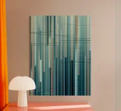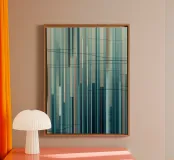 Een moderne abstracte digitale kunstprint met een compositie van verticale lijnen in een rustgevend kleurenpalet van blauw, groen, bruin en gedempt beige. De lijnen variëren in breedte en toon, waardoor een gevoel van diepte en ritme ontstaat, terwijl subtiele, vegende horizontale lijnen een dynamisch contrast toevoegen. Dit meubel roept een gevoel van rust en verfijning op, waardoor het een perfecte aanvulling is voor moderne woonkamers, kantoren of slaapkamers.