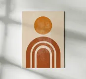 Breng warmte en evenwicht in je ruimte met dit abstracte geometrische kunstwerk met een zon- en boogontwerp in aardetinten. De minimalistische retro-esthetiek voegt een tijdloze, rustgevende touch toe aan elk interieur. Perfect voor een moderne, bohemien of Scandinavisch geïnspireerde inrichting.