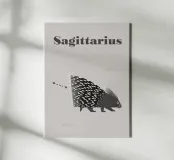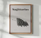 Grafische interpretatie van het sterrenbeeld Boogschutter. Een gestileerd stekelvarken en een pijl ontmoeten de letters Sagittarius. Heldere vormen en rustige grijstinten creëren een moderne look die het net zo goed doet in de woonkamer, studeerkamer en kinderkamer. Ideaal voor astrologiefans en als begin van een Zodiac-serie.