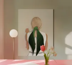 Een intieme en elegante close-up van de achterkant van een vloeiende olijfgroene jurk, gestrikt in een zachte strik. De minimalistische compositie en gedempte tinten creëren een tijdloze, verfijnde sfeer, perfect als statement art print voor moderne interieurs of door mode geïnspireerde ruimtes.