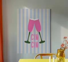 Hef het glas met dit vrolijke en retro-geïnspireerde kunstwerk dat wereldwijde toasts viert! Met het woord "Cheers" in een mix van levendige talen Cin Cin, Kanpai, Salute, Proost, Salud is dit kleurrijke ontwerp geplaatst in een gedurfd palet van felblauw, rood, roze en oranje op een zachte ivoorkleurige achtergrond. Decoratieve details zoals sterren, kleurrijke geruite randen en twee minimalistische wijnglazen in keyline-stijl voegen een speelse vintage twist toe. Perfect voor keukens, bars, cocktailhoeken of zelfs receptenboeken en theedoeken, dit stuk brengt goede vibes, goed gezelschap en een plons voor goede tijden!