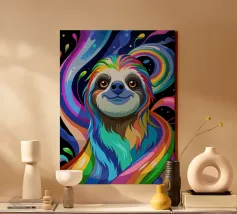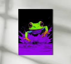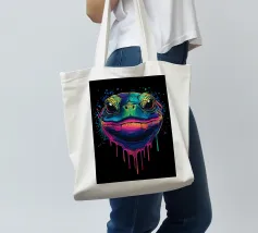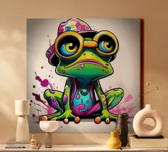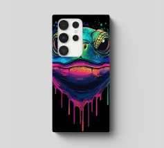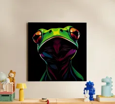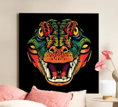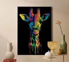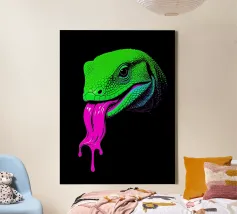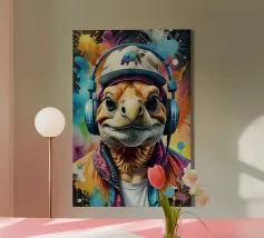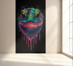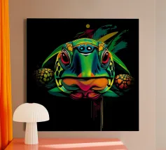 Een intens portret van een schildpad dat in het oog springt met sterke neonkleuren. De close-up van het gezicht van het dier boeit met felle tinten blauw, groen en roze, die overvloeien in een artistiek kleurverloop. Kleurspatten en vloeiende verfdruppels versterken het streetart-karakter van het beeld. De focus ligt op de grote ogen en de gedetailleerde schubben, die het motief een bijna levendige diepte geven. Het zwarte achtergrondvlak zorgt voor maximale kleurimpact en benadrukt de compositie krachtig.