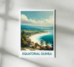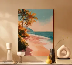 Een prachtige illustratie van een rustig strand op de Comoren, omzoomd met majestueuze palmbomen en omringd door weelderig groene bergen. Twee silhouetten wandelen vredig over het zand en creëren een ontspannen en exotische sfeer. Perfect voor een exotische muurdecoratie.