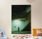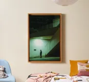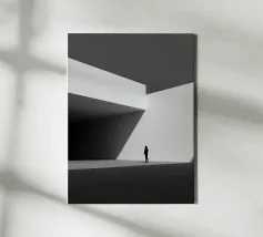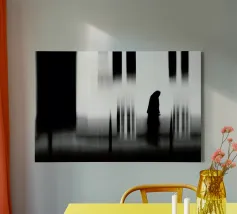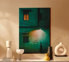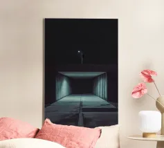 Een mysterieus silhouet in het felle licht van de minimalistische architectuur van Hanoi. Dit intrigerende en elegante tafereel neemt de kijker mee naar de raadselachtige wereld van de Aziatische nachten. Een ideaal artistiek stuk voor een hedendaags en boeiend interieur.