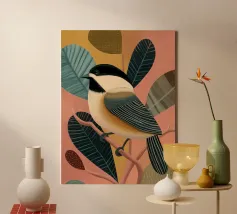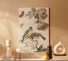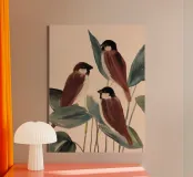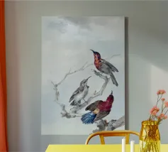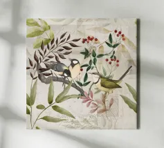 Een rustig tafereel van drie mussen op takken met eenvoudige bladeren.