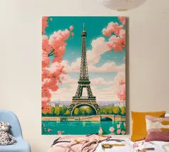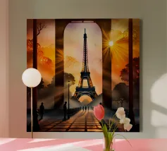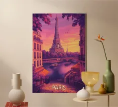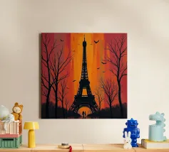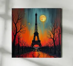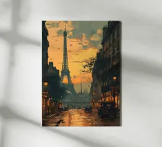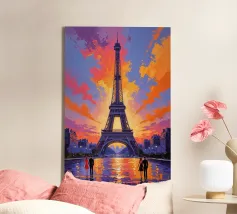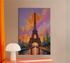 Een artistieke interpretatie van de Eiffeltoren badend in stralende oranje en paarse tinten, brengt dit olieverfschilderij de grandeur van Parijse avonden tot leven. De toren staat majestueus tegen een lucht met rijke textuur, terwijl het gloedvolle kanaal eronder zijn schoonheid weerspiegelt. De bomen en paden omlijsten de compositie en leiden het oog van de kijker naar het verlichte monument. Perfect voor bewonderaars van het impressionisme en liefhebbers van Parijs, viert dit stuk de fusie van natuur, architectuur en kunst.