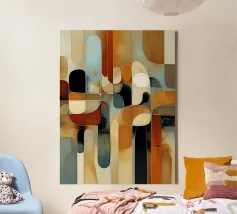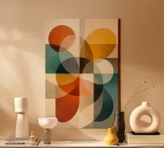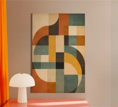 A rich, contemporary abstract composition built from layered geometric forms and deep, atmospheric colour. Curves and blocks intersect in a carefully balanced arrangement, creating a sense of architectural rhythm and visual depth. The surface texture adds a subtle, painterly warmth, softening the geometry and giving the work a tactile, crafted presence.
