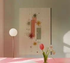 Een opvallende weergave van abstract vuurwerk in een strakke Bauhaus-geometrie. Stralende lijnen en gedurfde cirkelvormige uitbarstingen verlichten het donkere canvas met feestelijk contrast en minimalistische flair. Een feest van beweging, ritme en vakantiemagie - perfect voor moderne interieurs die op zoek zijn naar een unieke seizoensgebonden twist.