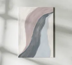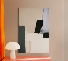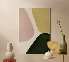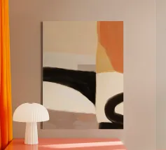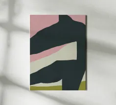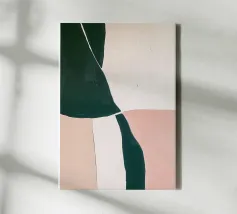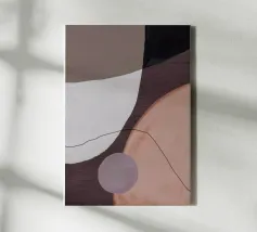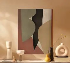 Abstracte vormen in gedempte tinten creëren een harmonieuze compositie. Verschillende tinten bruin, zwart en beige domineren de visuele ruimte met subtiele accenten van groen en wit.
