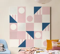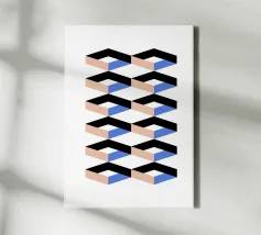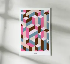 Een geometrisch patroon van in elkaar grijpende vierkanten in roze, blauwe en zwarte tinten creëert een optische illusie. Het repetitieve ontwerp geeft een gevoel van diepte en beweging.