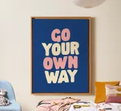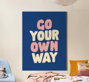 Voeg een vleugje positiviteit toe aan je kamer met deze levendige kunstprint met de zin "Go Your Own Way" in vette, handgetekende roze en witte letters op een opvallende blauwe achtergrond. Het speelse ontwerp en de opbeurende boodschap maken het perfect voor het opfleuren van slaapkamers, kantoren of creatieve studio's. Deze print is ideaal als attent cadeau voor verjaardagen, diploma's of Kerstmis en geeft zelfvertrouwen en individualiteit. De opvallende kleuren en unieke stijl zorgen ervoor dat het opvalt, waardoor het een prachtige aanvulling is op elke moderne of eclectische inrichting.