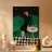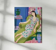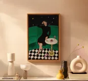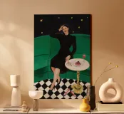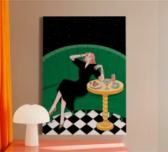 Een vrouw in een elegante zwarte jurk ontspant op een groene bank op een dambordvloer, met een nachtelijke sterrenhemel achter haar, waardoor een surrealistische en chique hemelse scène ontstaat.