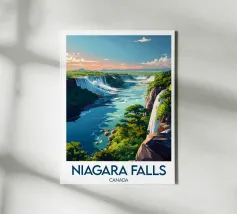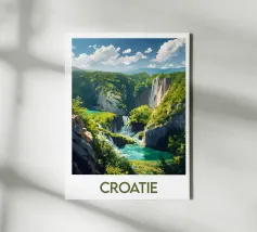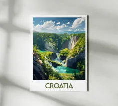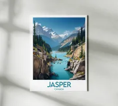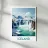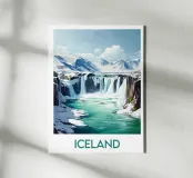 Artistieke poster van IJsland met een krachtige waterval omringd door besneeuwde bergen en turquoise water. Een indrukwekkend beeld om je muurdecoratie een Scandinavisch tintje te geven.