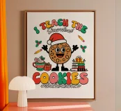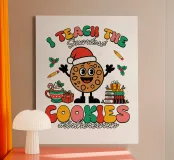 Een vrolijk koekje met een kerstmuts is omringd door feestelijke decoraties, boeken en warme chocolademelk. De woorden "I teach the smartest cookies #tistheseason" voegen een speelse boodschap met vakantiethema toe.