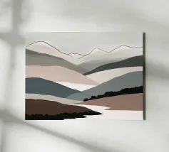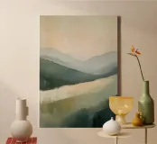 Een minimalistisch olieverfschilderij met een impasto-techniek en krachtige penseelstreken, met groene bergen tegen een lichtgele lucht. Een witte rivier stroomt door de vallei, waarbij het neutrale kleurenpalet een rustgevend effect creëert. De heuvels in de verte zijn zacht getekend en tonen een moderne kunststijl met abstracte vormen en lijnen. De algehele compositie is harmonieus en de zachte verlichting benadrukt het tafereel.