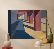 De grimmige geometrie van een overdekte wandelgang wordt gedefinieerd door krachtige karmozijnrode pilaren en de lange, scherpe schaduwen die ze werpen in het felle zonlicht. Dit schilderij is een krachtige studie van licht, schaduw, kleur en architectonische vorm.
