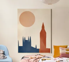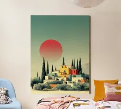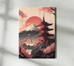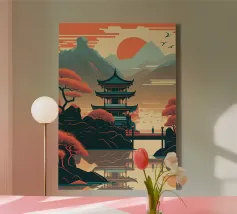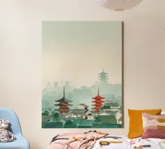 Stap in de serene schoonheid van Japan met deze minimalistische reisposter geïnspireerd door de iconische pagode tempels van Kyoto. Met gedurfde geometrische vormen, overlappende zon- en maancirkels en rijke groenrode tinten combineert dit kunstwerk modern design met traditionele rust. Perfect als muurprint voor liefhebbers van de Japanse cultuur, zen-decor en grafische reiskunst. Een opvallend statement voor elke ruimte.