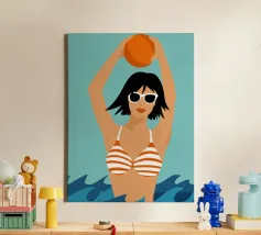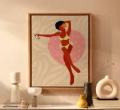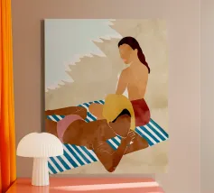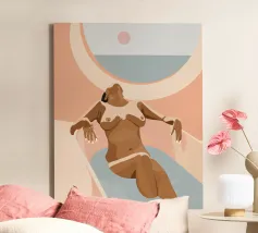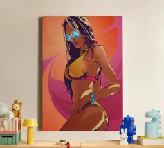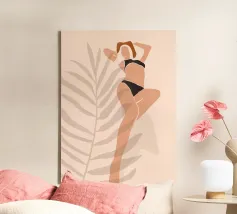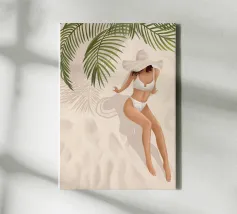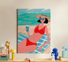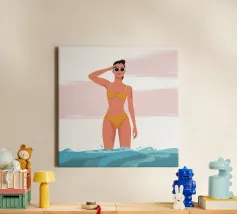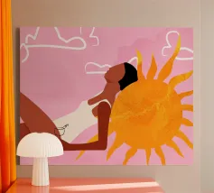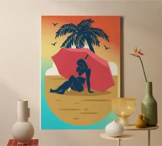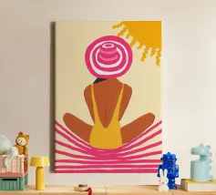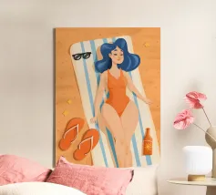 Een stijlvolle minimalistische illustratie van een vrouw in een gele bikini, loungend op een roze vlot in een tropische omgeving. De warme, zonovergoten tinten en retro-esthetiek roepen een gevoel van ontspanning en zomerse gelukzaligheid op. Perfect om een vleugje vakantiegevoel toe te voegen aan elke ruimte.