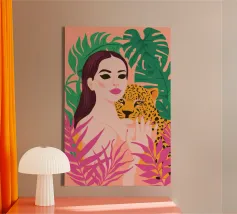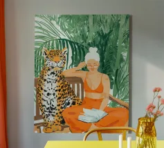 This artwork captures a person in a black dress striking a poised pose beside a leopard. The scene exudes sophistication, confidence, and timeless artistry.