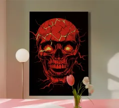 A vibrant and surreal digital illustration of an alien-like skull merging into a dripping light bulb, featuring neon green and magenta colors against a dark purple background. The eerie, dripping design combines horror and sci-fi aesthetics.