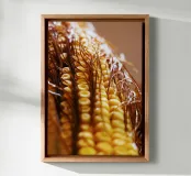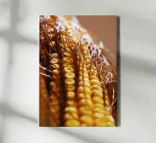Een rauwe maïskolf verticaal gevangen, waarbij de netjes gelijnde pitten en de vloeiende bruine zijde zichtbaar zijn. De natuurlijke texturen en subtiele kleuren creëren een abstracte maar speelse compositie, waardoor het een eigenzinnige en charmante toevoeging is aan keukens, eethoeken of moderne eclectische ruimtes.