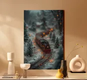 Model stoomtrein in winters bos met bokeh verlichting canvas