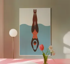Zeepatroon - Moderne retro poster met zwemmer Dit kleurrijke ontwerp toont een gestileerde vrouw in een zwempak met patroon en retro flair. Het abstracte zeepatroon van koraal, zeewier en golven geeft het motief een zomerse lichtheid en grafische diepte. "Sea Pattern" viert de zee, de zomer en de kracht van vrouwelijke sereniteit - modern, esthetisch en vol kleur. Ideaal voor badkamers, woonkamers of creatieve ruimtes met een voorliefde voor design, mode en de mediterrane geest.