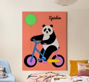 "Panda met fiets en ballon" is een kleurrijke en schattige illustratie met een panda die plezier heeft op een fiets terwijl hij een ballon draagt.