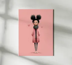 Een meisje in roze rok en blauw patch jack staat kalm en zelfverzekerd tegen een schone witte achtergrond.